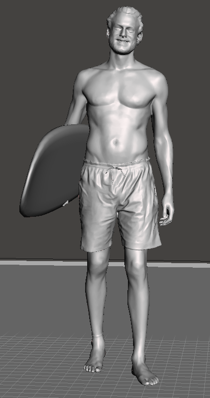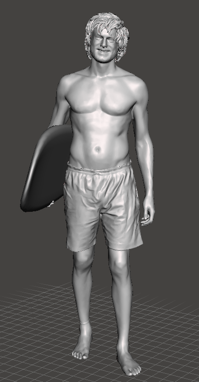Surfista com prancha de lado, disponivel com cabelo cacheado e cabelho recolhido.